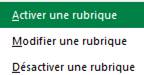 S'affichent ici les rubriques du bulletin modèle associé ; il est possible de modifier ou désactiver une rubrique existante ou encore d'activer une rubrique ne figurant pas dans le bulletin modèle.